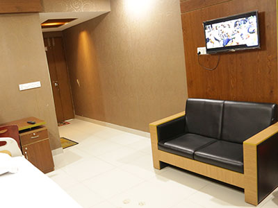 A/C, NON-A/C both type available based on budget. Each room equipped with wall-mounted TV, Sofa, dressing table & cloth hangers.